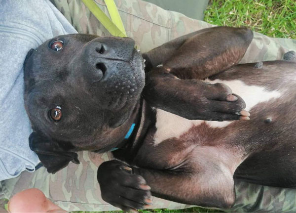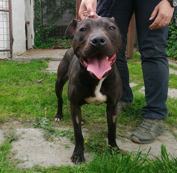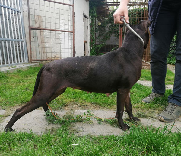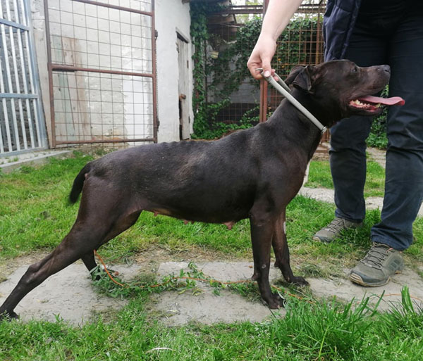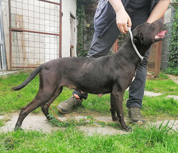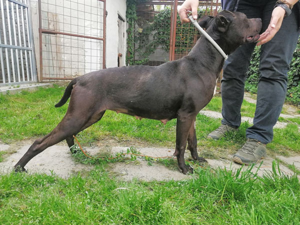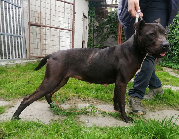 Cuki wurde Anfangs Mai zusammen mit über 70 weiteren Hunden von der Polizei aus einer Horror-Welpenfabrik befreit. Die grösstenteils erwachsenen Hunde, alles Staffis die zur "Zucht" missbraucht wurden, waren allesamt in einem katastrophalen und geschwächten Zustand. Die anwesenden Tierärze mussten einige völlig dehydrierte und zum Skelett abgemagerten Hunde notfallmässig in die Klinik bringen, offene Wunden, Geschwüre, Hautparasiten und Schlimmeres behandeln. Alle Hunde wurden auf verschiedene Tierheime verteilt, auch das Tierheim Nagyatad hat zwei dieser armen Kreaturen aufgenommen. Cuki hatte Herzwürmer die umgehend behandelt werden mussten. Trotz all der erlittenen Qualen ist Cuki eine zutrauliche Hündin und hätte nach all den Erlebnissen jetzt lieber einen Einzelplatz, den sie nicht mehr mit anderen teilen muss.