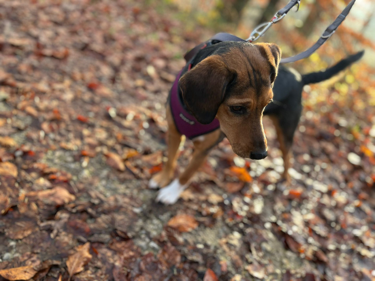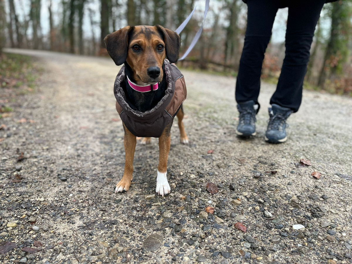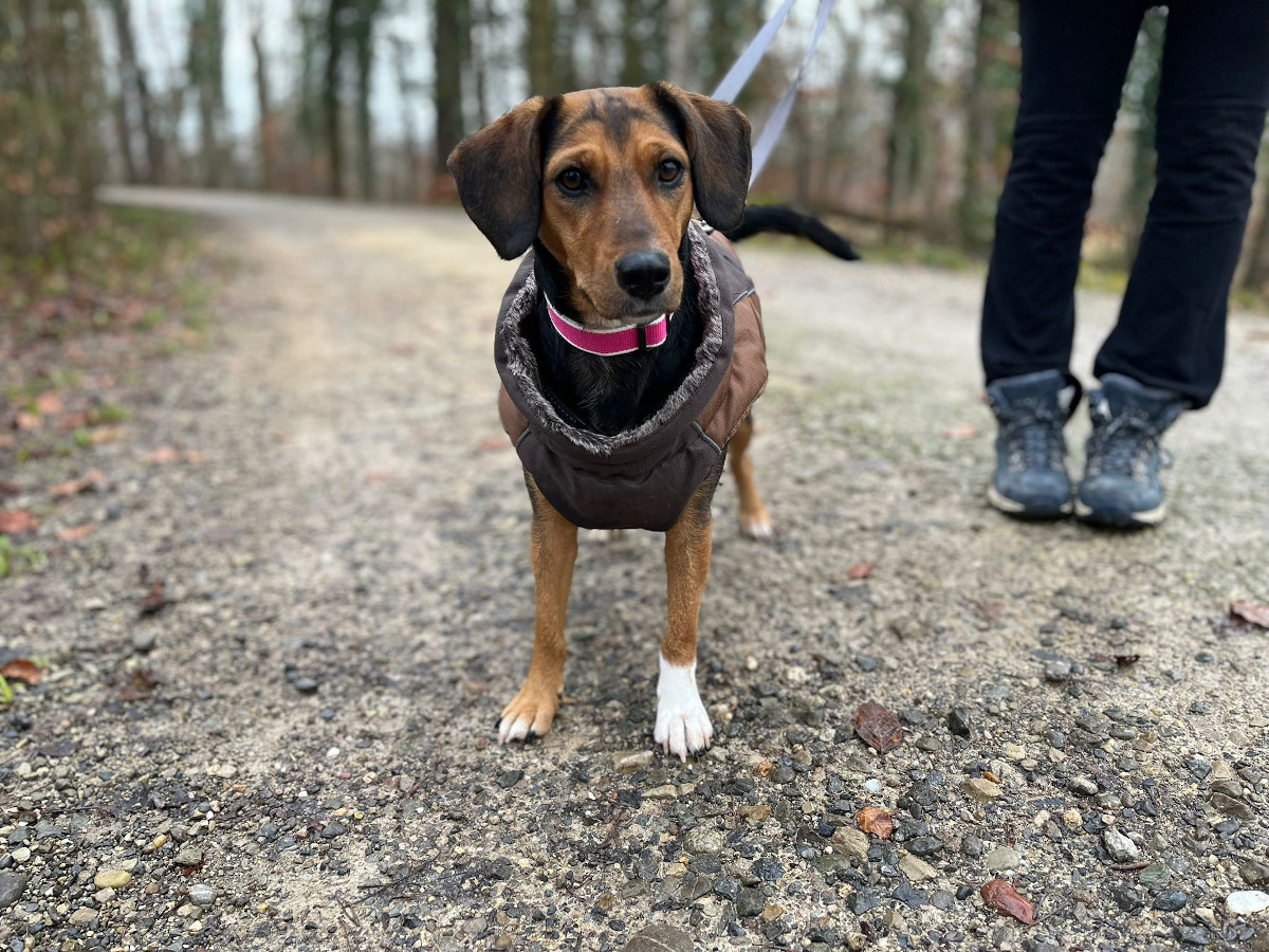 Leinenlaufen? Überraschend gut! Manchmal schaut sie unterwegs zwar noch so, als würde sie die ganze Welt gleichzeitig entdecken wollen, aber das macht sie nur um sicherzugehen, dass die Schweiz wirklich so schön ist wie alle sagen.