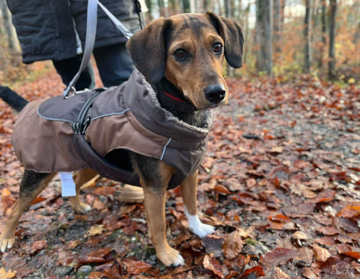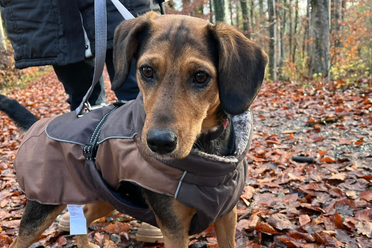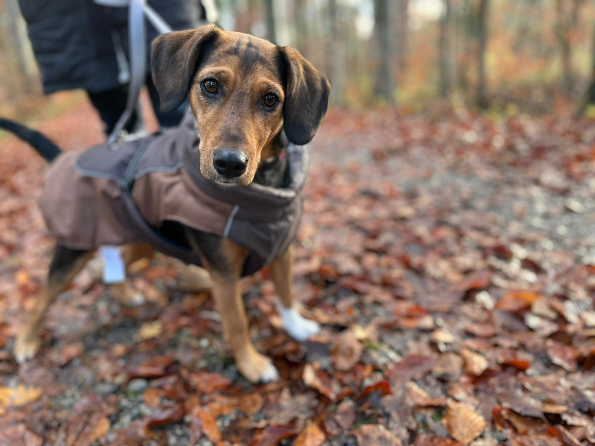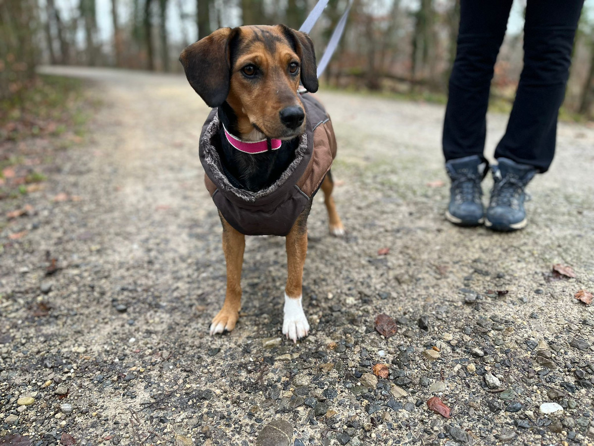 Leinenlaufen? Überraschend gut! Manchmal schaut sie unterwegs zwar noch so, als würde sie die ganze Welt gleichzeitig entdecken wollen, aber das macht sie nur um sicherzugehen, dass die Schweiz wirklich so schön ist wie alle sagen.