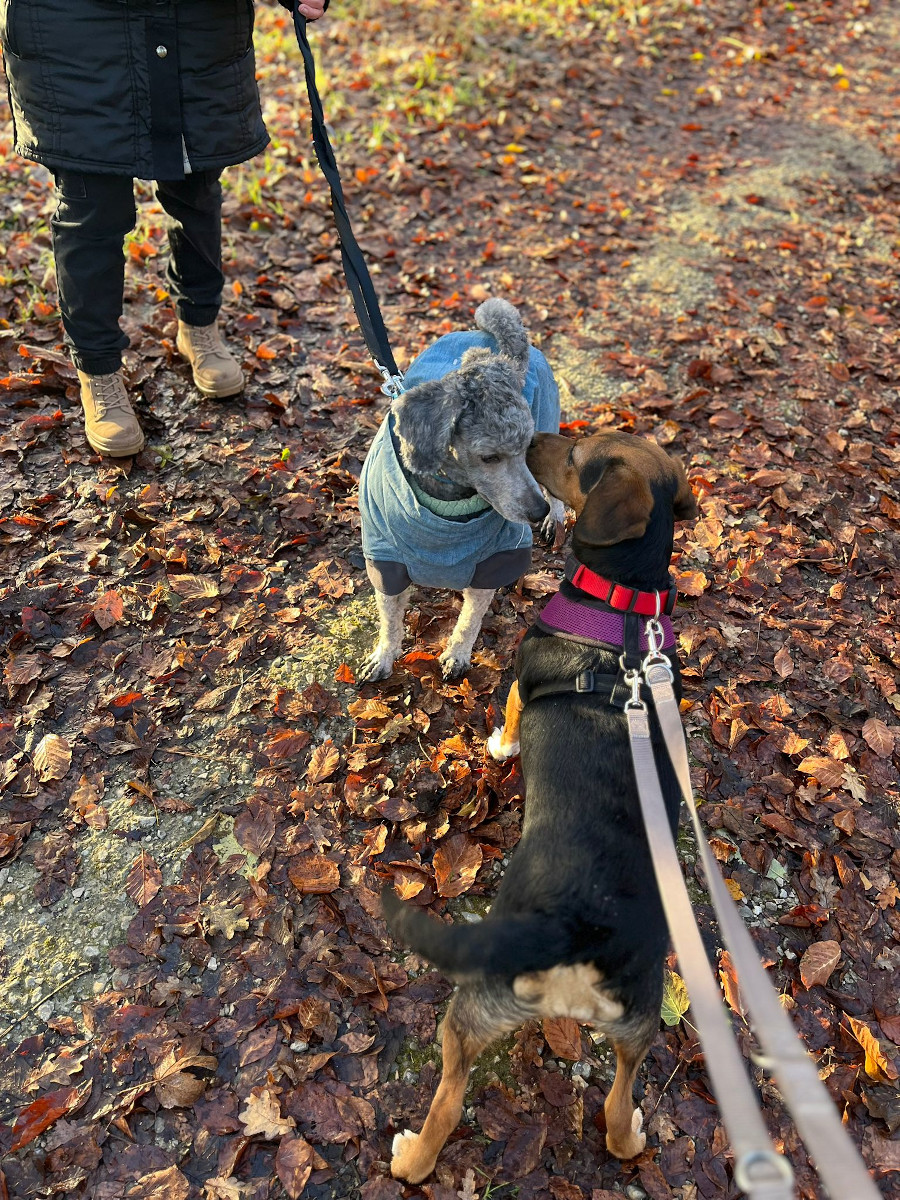Freundlich zu anderen Hunden? Ja! Vor allem mit Gleichgrossen versteht sie sich prima. Bei kleineren Hunden ist sie manchmal noch ein bisschen… sagen wir mal: enthusiastisch-unbeholfen. Sie meint es gut, sie hat einfach grosse Pfoten und ein noch grösseres Herz.