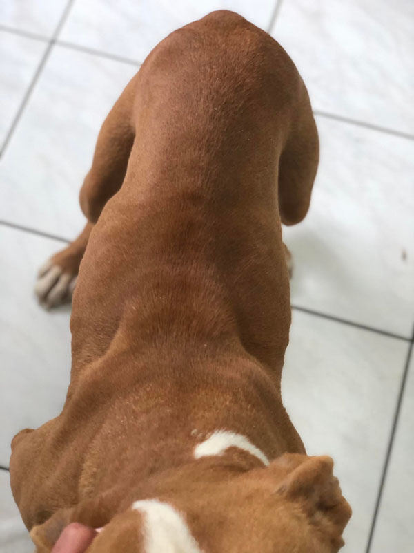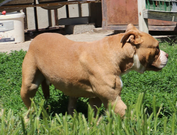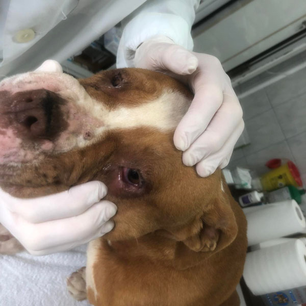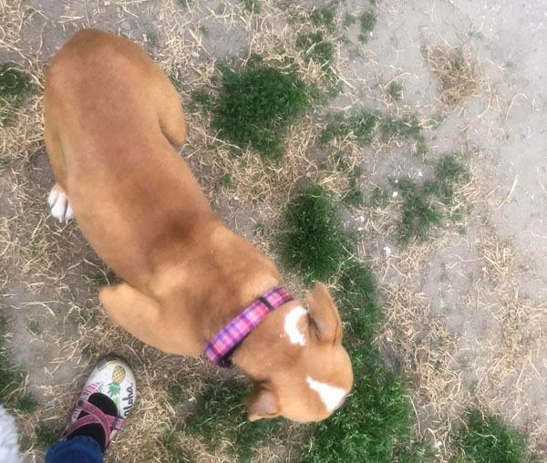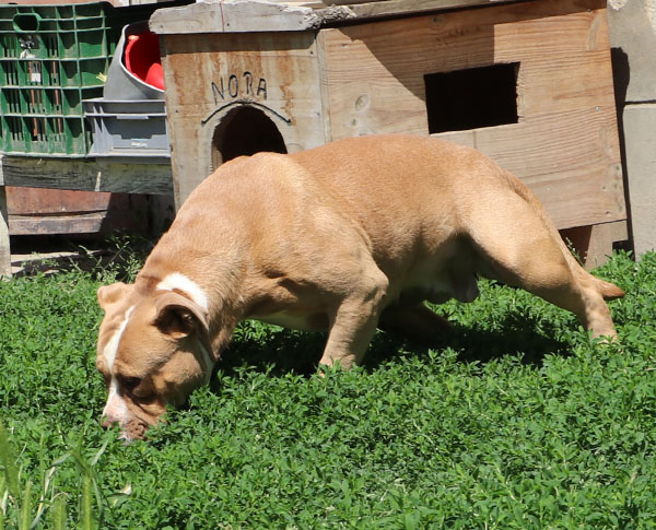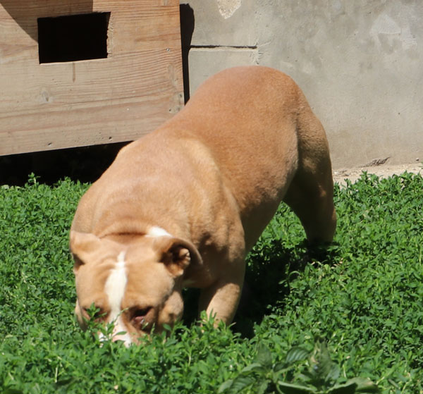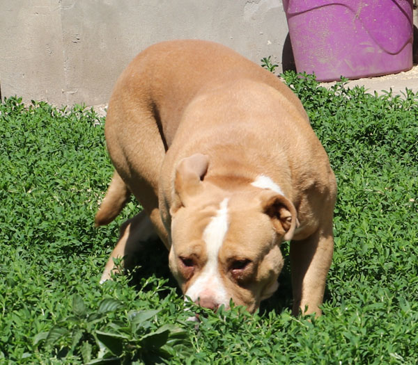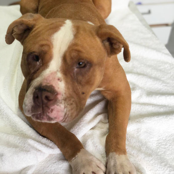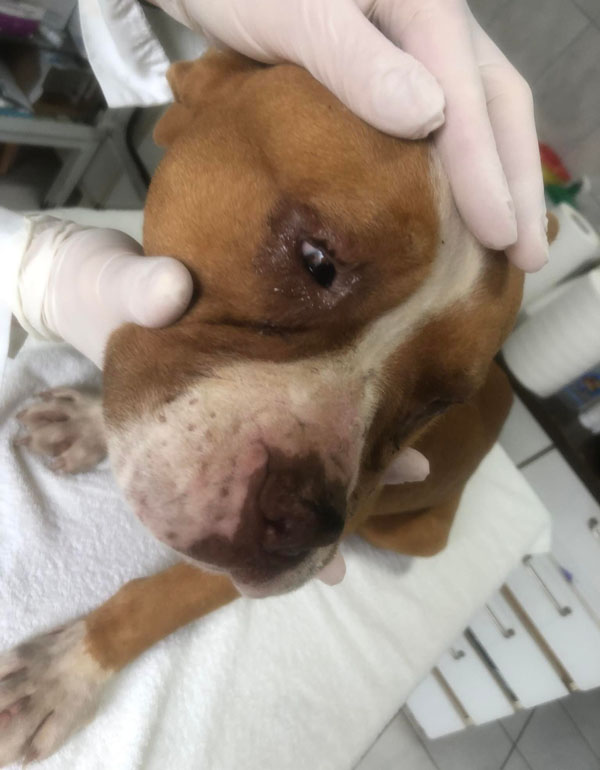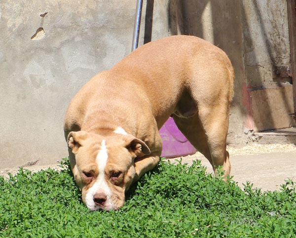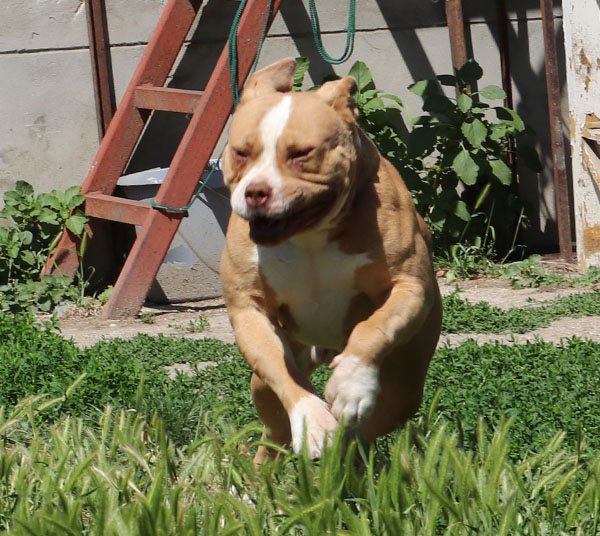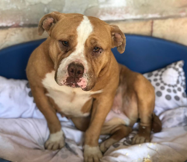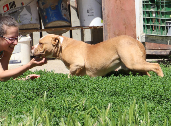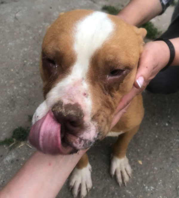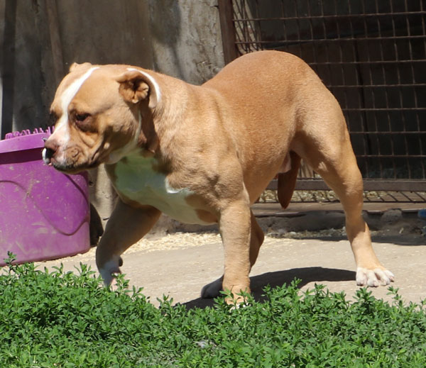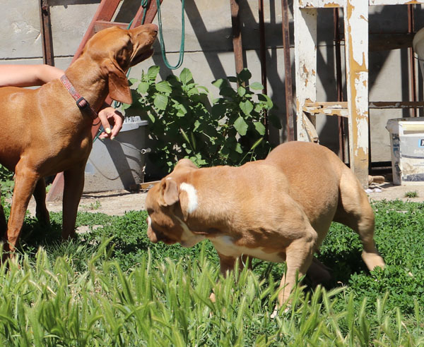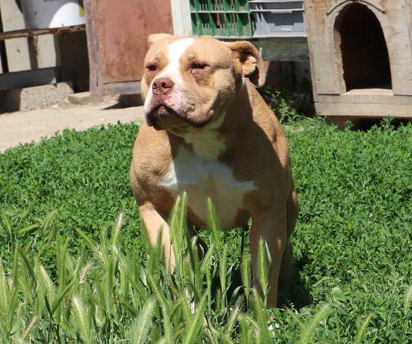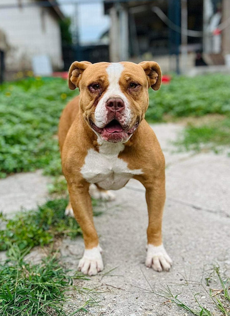 Bubu wurde Anfangs Mai zusammen mit über 70 weiteren Hunden von der Polizei aus einer Horror-Welpenfabrik befreit. Die grösstenteils erwachsenen Hunde, alles Staffis die zur "Zucht" missbraucht wurden, waren allesamt in einem katastrophalen und geschwächten Zustand. Die anwesenden Tierärze mussten einige völlig dehydrierte und zum Skelett abgemagerten Hunde notfallmässig in die Klinik bringen, offene Wunden, Geschwüre, Hautparasiten und Schlimmeres behandeln. Alle Hunde wurden auf verschiedene Tierheime verteilt, auch das Tierheim Nagyatad hat zwei dieser armen Kreaturen aufgenommen. Bubu hatte Giardien und erhielt die entsprechenden Medikamente, ausserdem chronisch entzündete Augen, die eingerollten Augenlider mussten operiert werden. Trotz all der erlittenen Qualen ist Bubu eine liebe Hündin, die sich anfänglich aber recht zurückhaltend zeigt. Sie ist verträglich mit anderen Hunden.